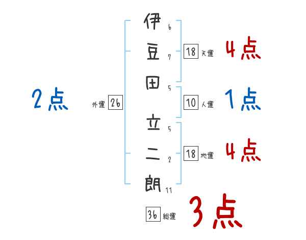 総運![]() | 伊豆田立二朗さんの総運は36画の3つ星!先見性が豊かです。多少神経質で苦労することも。 あなたの人生を表す1番重要な運勢です。生涯を通じて影響する総合運となり、主に50歳以降の晩年期に影響を及ぼします。 |