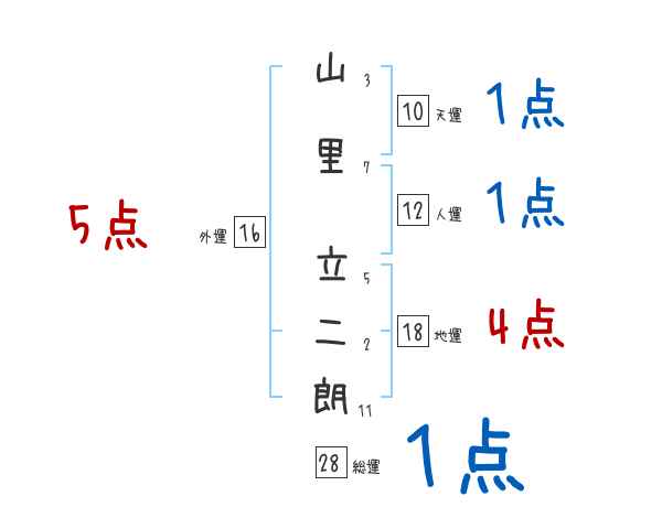 天運![]() | 山里立二朗さんの天運は10画の1つ星!不安を感じやすい傾向。ストレスを抱えないように注意しましょう。 家系が持つ宿命的な運勢を表します。祖先から受け継いだ苗字ですので自分の力が及びません。家柄を象徴します。 |