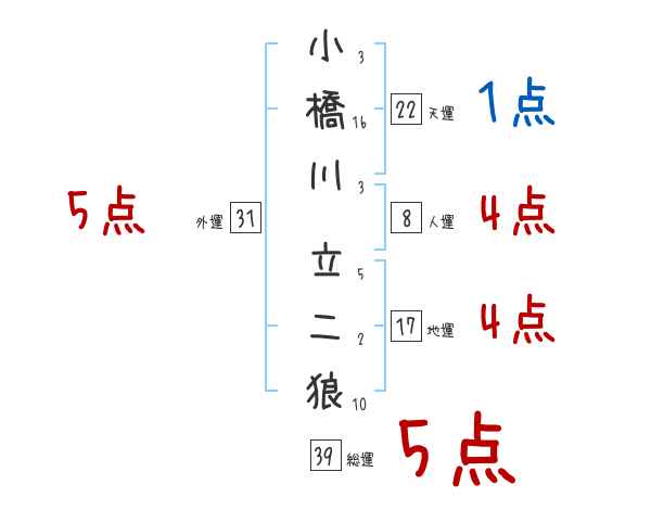 総運![]() | 小橋川立二狼さんの総運は39画の5つ星!社交性に優れ人望が厚い。人の上に立ち成功する。 あなたの人生を表す1番重要な運勢です。生涯を通じて影響する総合運となり、主に50歳以降の晩年期に影響を及ぼします。 |