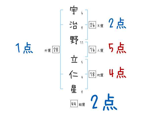 総運![]() | 宇治野立仁星さんの総運は44画の2つ星!誠実で慎重な性格。物事を考えすぎないように注意しましょう。 あなたの人生を表す1番重要な運勢です。生涯を通じて影響する総合運となり、主に50歳以降の晩年期に影響を及ぼします。 |