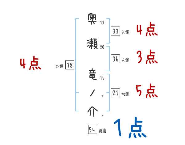 総運![]() | 奥瀬竜ノ介さんの総運は54画の1つ星!トラブルが多いかも。周りをよく見て協調して過ごしましょう。 あなたの人生を表す1番重要な運勢です。生涯を通じて影響する総合運となり、主に50歳以降の晩年期に影響を及ぼします。 |