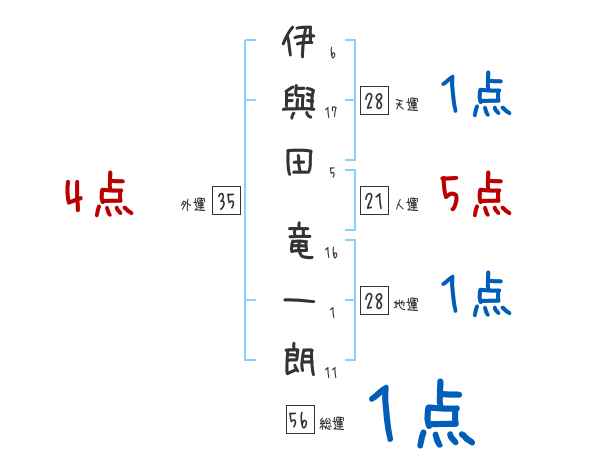天運![]() | 伊與田竜一朗さんの天運は28画の1つ星!家庭環境に注意。スポーツで活躍できる能力があるかも。 家系が持つ宿命的な運勢を表します。祖先から受け継いだ苗字ですので自分の力が及びません。家柄を象徴します。 |