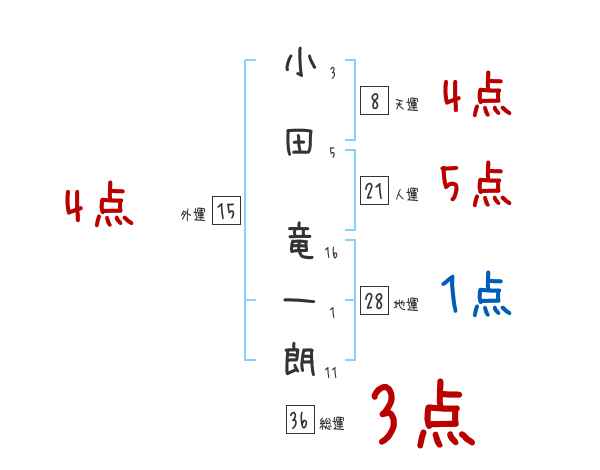 総運![]() | 小田竜一朗さんの総運は36画の3つ星!先見性が豊かです。多少神経質で苦労することも。 あなたの人生を表す1番重要な運勢です。生涯を通じて影響する総合運となり、主に50歳以降の晩年期に影響を及ぼします。 |