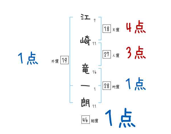 天運![]() | 江崎竜一朗さんの天運は18画の4つ星!情熱的で剛気。忍耐力があり信頼される。 家系が持つ宿命的な運勢を表します。祖先から受け継いだ苗字ですので自分の力が及びません。家柄を象徴します。 |