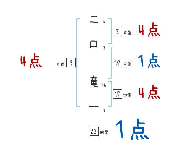 天運![]() | 二口竜一さんの天運は5画の4つ星!健康で安泰。協調性に優れ、財産に恵まれる。 家系が持つ宿命的な運勢を表します。祖先から受け継いだ苗字ですので自分の力が及びません。家柄を象徴します。 |