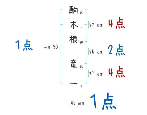 天運![]() | 駒木根竜一さんの天運は29画の4つ星!完全主義で才能がある。厳格な心の持ち主。 家系が持つ宿命的な運勢を表します。祖先から受け継いだ苗字ですので自分の力が及びません。家柄を象徴します。 |