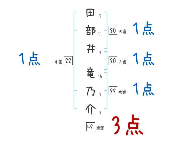 外運![]() | 田部井竜乃介さんの外運は22画の1つ星!努力することが苦手ないっぽう手先が器用。芸術性にも優れる。 生活面を象徴する運勢です。外部から受ける影響力を表し、結婚運、家庭運や職場、環境への順応性を表します。 |