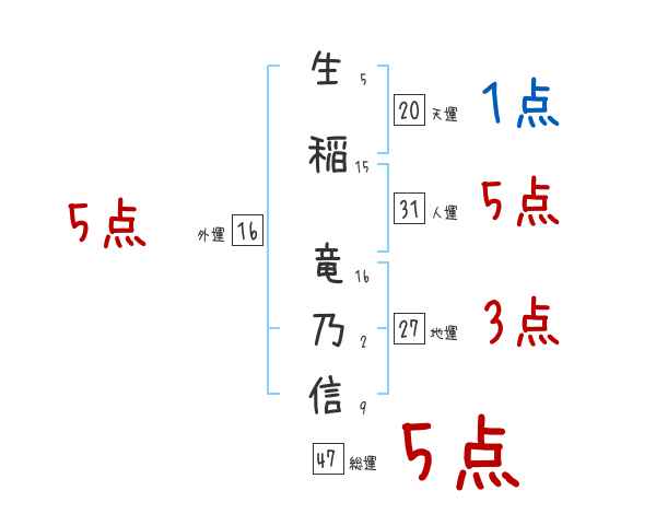 外運![]() | 生稲竜乃信さんの外運は16画の5つ星!人望が厚く大きく発展する。逆転成功が見える。 生活面を象徴する運勢です。外部から受ける影響力を表し、結婚運、家庭運や職場、環境への順応性を表します。 |