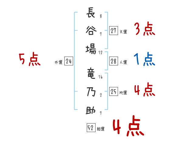外運![]() | 長谷場竜乃助さんの外運は24画の5つ星!家庭運が良く順調な人生。金運にも恵まれる。 生活面を象徴する運勢です。外部から受ける影響力を表し、結婚運、家庭運や職場、環境への順応性を表します。 |
