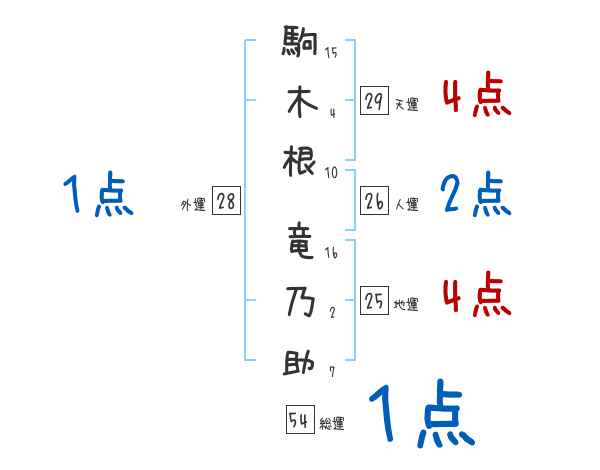 天運![]() | 駒木根竜乃助さんの天運は29画の4つ星!完全主義で才能がある。厳格な心の持ち主。 家系が持つ宿命的な運勢を表します。祖先から受け継いだ苗字ですので自分の力が及びません。家柄を象徴します。 |