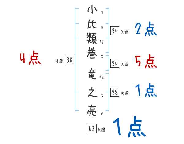 外運![]() | 小比類巻竜之亮さんの外運は38画の4つ星!温厚な性格で技術的な才能を発揮する。職人的な仕事に向いている。 生活面を象徴する運勢です。外部から受ける影響力を表し、結婚運、家庭運や職場、環境への順応性を表します。 |