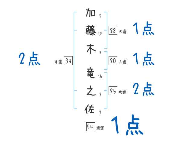 天運![]() | 加藤木竜之佐さんの天運は28画の1つ星!家庭環境に注意。スポーツで活躍できる能力があるかも。 家系が持つ宿命的な運勢を表します。祖先から受け継いだ苗字ですので自分の力が及びません。家柄を象徴します。 |