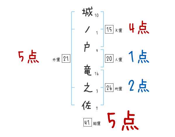 天運![]() | 城ノ戸竜之佐さんの天運は15画の4つ星!人徳があり出世する。順調に物事を進め円満な人生。 家系が持つ宿命的な運勢を表します。祖先から受け継いだ苗字ですので自分の力が及びません。家柄を象徴します。 |