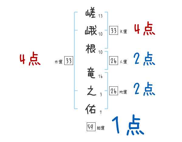 外運![]() | 嵯峨根竜之佑さんの外運は33画の4つ星!権力志向でプライドが高い。勇気があり運を切り開き成功する。 生活面を象徴する運勢です。外部から受ける影響力を表し、結婚運、家庭運や職場、環境への順応性を表します。 |