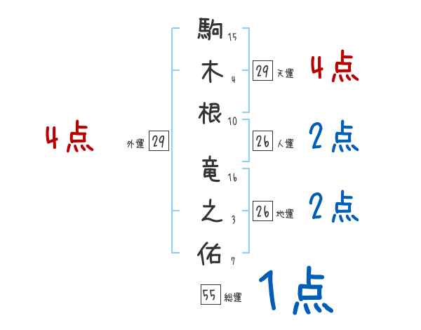 天運![]() | 駒木根竜之佑さんの天運は29画の4つ星!完全主義で才能がある。厳格な心の持ち主。 家系が持つ宿命的な運勢を表します。祖先から受け継いだ苗字ですので自分の力が及びません。家柄を象徴します。 |