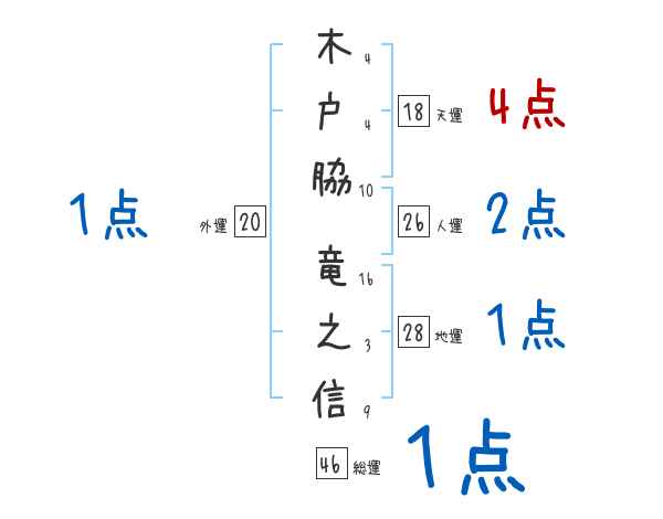 天運![]() | 木戸脇竜之信さんの天運は18画の4つ星!情熱的で剛気。忍耐力があり信頼される。 家系が持つ宿命的な運勢を表します。祖先から受け継いだ苗字ですので自分の力が及びません。家柄を象徴します。 |