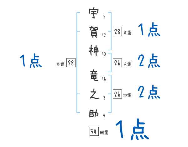 天運![]() | 宇賀神竜之助さんの天運は28画の1つ星!家庭環境に注意。スポーツで活躍できる能力があるかも。 家系が持つ宿命的な運勢を表します。祖先から受け継いだ苗字ですので自分の力が及びません。家柄を象徴します。 |