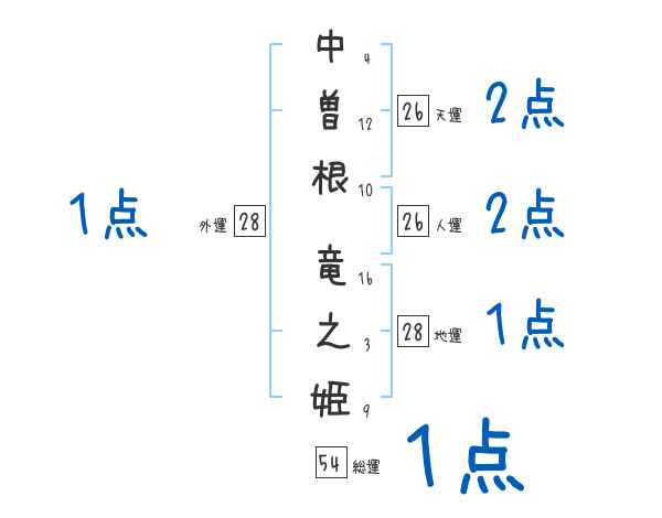 外運![]() | 中曽根竜之姫さんの外運は28画の1つ星!家庭環境に注意。スポーツで活躍できる能力があるかも。 生活面を象徴する運勢です。外部から受ける影響力を表し、結婚運、家庭運や職場、環境への順応性を表します。 |