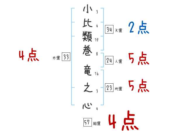 外運![]() | 小比類巻竜之心さんの外運は33画の4つ星!権力志向でプライドが高い。勇気があり運を切り開き成功する。 生活面を象徴する運勢です。外部から受ける影響力を表し、結婚運、家庭運や職場、環境への順応性を表します。 |