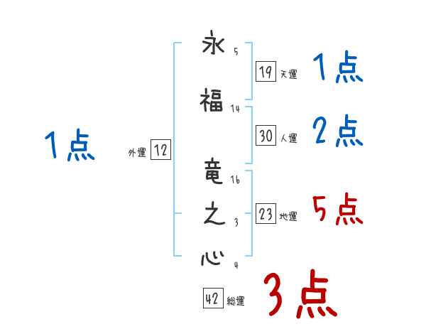 天運![]() | 永福竜之心さんの天運は19画の1つ星!優れた才能を持ちますが、協調性が足りないことも。周りの人と協力する事を意識しましょう。 家系が持つ宿命的な運勢を表します。祖先から受け継いだ苗字ですので自分の力が及びません。家柄を象徴します。 |