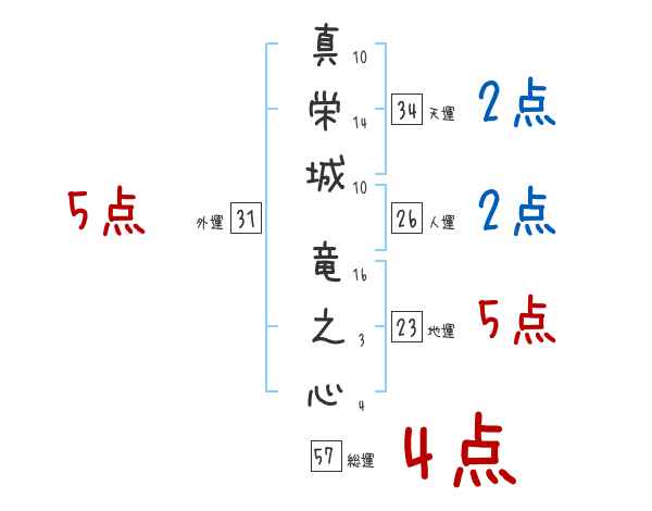 総運![]() | 真栄城竜之心さんの総運は57画の4つ星!向上心があり人望がある。地位を得る。 あなたの人生を表す1番重要な運勢です。生涯を通じて影響する総合運となり、主に50歳以降の晩年期に影響を及ぼします。 |