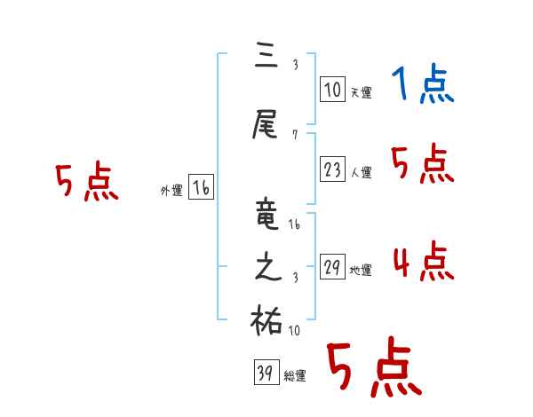 天運![]() | 三尾竜之祐さんの天運は10画の1つ星!不安を感じやすい傾向。ストレスを抱えないように注意しましょう。 家系が持つ宿命的な運勢を表します。祖先から受け継いだ苗字ですので自分の力が及びません。家柄を象徴します。 |