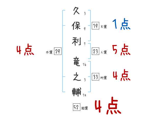 外運![]() | 久保利竜之輔さんの外運は29画の4つ星!完全主義で才能がある。厳格な心の持ち主。 生活面を象徴する運勢です。外部から受ける影響力を表し、結婚運、家庭運や職場、環境への順応性を表します。 |
