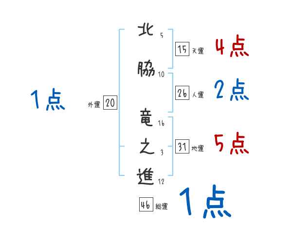 総運![]() | 北脇竜之進さんの総運は46画の1つ星!迷走することが多く苦労するかも。目先のことにとらわれないように。 あなたの人生を表す1番重要な運勢です。生涯を通じて影響する総合運となり、主に50歳以降の晩年期に影響を及ぼします。 |
