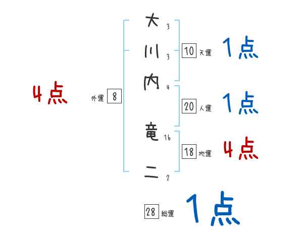 総運![]() | 大川内竜二さんの総運は28画の1つ星!家庭環境に注意。スポーツで活躍できる能力があるかも。 あなたの人生を表す1番重要な運勢です。生涯を通じて影響する総合運となり、主に50歳以降の晩年期に影響を及ぼします。 |