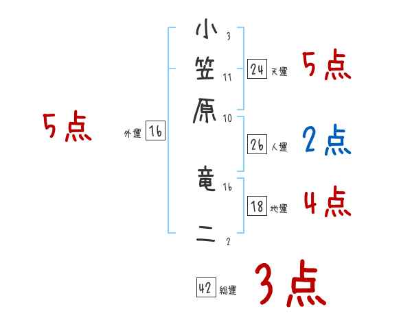 外運![]() | 小笠原竜二さんの外運は16画の5つ星!人望が厚く大きく発展する。逆転成功が見える。 生活面を象徴する運勢です。外部から受ける影響力を表し、結婚運、家庭運や職場、環境への順応性を表します。 |