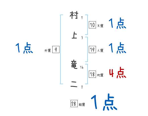 総運![]() | 村上竜二さんの総運は28画の1つ星!家庭環境に注意。スポーツで活躍できる能力があるかも。 あなたの人生を表す1番重要な運勢です。生涯を通じて影響する総合運となり、主に50歳以降の晩年期に影響を及ぼします。 |
