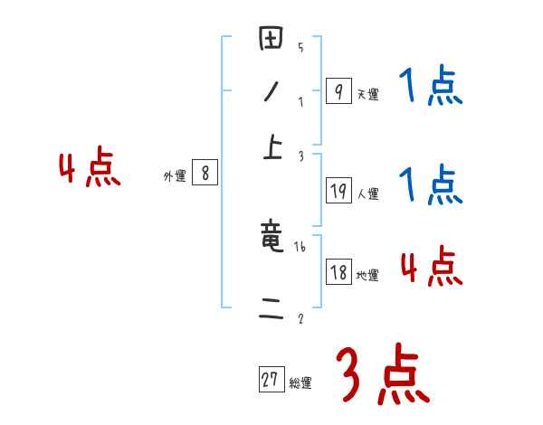 天運![]() | 田ノ上竜二さんの天運は9画の1つ星!消極的で才能を発揮することが苦手なことも。周りの意見に耳を傾けましょう。 家系が持つ宿命的な運勢を表します。祖先から受け継いだ苗字ですので自分の力が及びません。家柄を象徴します。 |