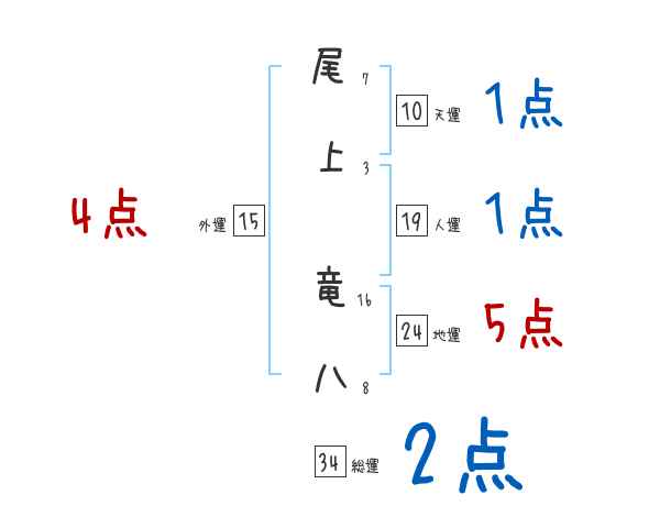 総運![]() | 尾上竜八さんの総運は34画の2つ星!独創性に優れるが、自尊心が強く災難に注意しましょう。 あなたの人生を表す1番重要な運勢です。生涯を通じて影響する総合運となり、主に50歳以降の晩年期に影響を及ぼします。 |