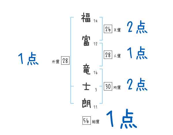 外運![]() | 福富竜士朗さんの外運は28画の1つ星!家庭環境に注意。スポーツで活躍できる能力があるかも。 生活面を象徴する運勢です。外部から受ける影響力を表し、結婚運、家庭運や職場、環境への順応性を表します。 |