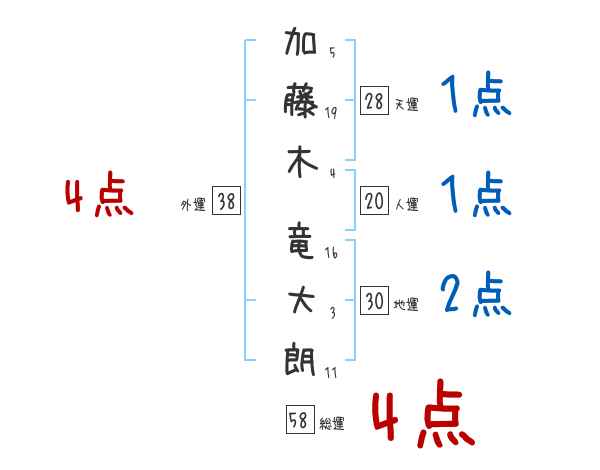 総運![]() | 加藤木竜大朗さんの総運は58画の4つ星!安定した生活。大器晩成タイプ。 あなたの人生を表す1番重要な運勢です。生涯を通じて影響する総合運となり、主に50歳以降の晩年期に影響を及ぼします。 |