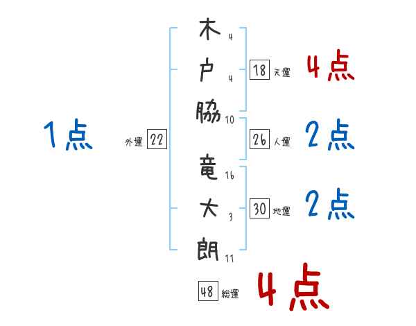 天運![]() | 木戸脇竜大朗さんの天運は18画の4つ星!情熱的で剛気。忍耐力があり信頼される。 家系が持つ宿命的な運勢を表します。祖先から受け継いだ苗字ですので自分の力が及びません。家柄を象徴します。 |