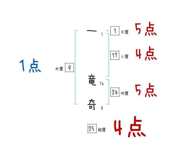 天運![]() | 一竜奇さんの天運は1画の5つ星!行動力、指導力があり出世し繁栄する。幸運に恵まれる。 家系が持つ宿命的な運勢を表します。祖先から受け継いだ苗字ですので自分の力が及びません。家柄を象徴します。 |