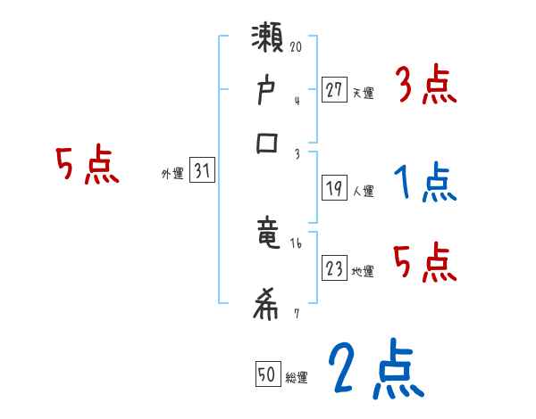 外運![]() | 瀬戸口竜希さんの外運は31画の5つ星!社交性があり判断力に優れる。順風満帆な人生で円満な生活。 生活面を象徴する運勢です。外部から受ける影響力を表し、結婚運、家庭運や職場、環境への順応性を表します。 |