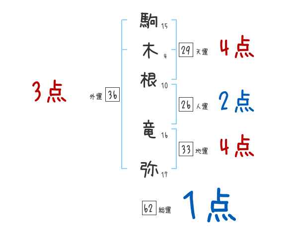 外運![]() | 駒木根竜弥さんの外運は36画の3つ星!先見性が豊かです。多少神経質で苦労することも。 生活面を象徴する運勢です。外部から受ける影響力を表し、結婚運、家庭運や職場、環境への順応性を表します。 |