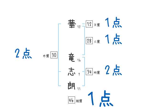 天運![]() | 華竜志朗さんの天運は12画の1つ星!簡単な失敗で諦めてしまいやすいかも。着実に行動すると良いでしょう。 家系が持つ宿命的な運勢を表します。祖先から受け継いだ苗字ですので自分の力が及びません。家柄を象徴します。 |