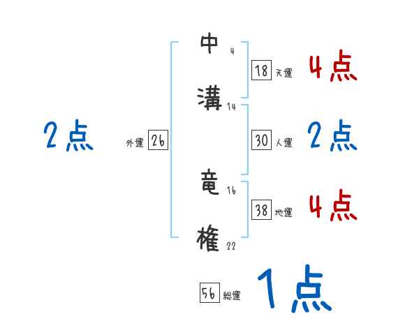 天運![]() | 中溝竜権さんの天運は18画の4つ星!情熱的で剛気。忍耐力があり信頼される。 家系が持つ宿命的な運勢を表します。祖先から受け継いだ苗字ですので自分の力が及びません。家柄を象徴します。 |
