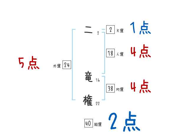 外運![]() | 二竜権さんの外運は24画の5つ星!家庭運が良く順調な人生。金運にも恵まれる。 生活面を象徴する運勢です。外部から受ける影響力を表し、結婚運、家庭運や職場、環境への順応性を表します。 |