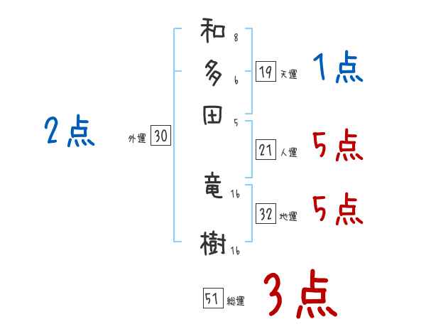 外運![]() | 和多田竜樹さんの外運は30画の2つ星!浮き沈みの激しさに注意しましょう。 生活面を象徴する運勢です。外部から受ける影響力を表し、結婚運、家庭運や職場、環境への順応性を表します。 |