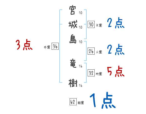 天運![]() | 宮城島竜樹さんの天運は30画の2つ星!浮き沈みの激しさに注意しましょう。 家系が持つ宿命的な運勢を表します。祖先から受け継いだ苗字ですので自分の力が及びません。家柄を象徴します。 |