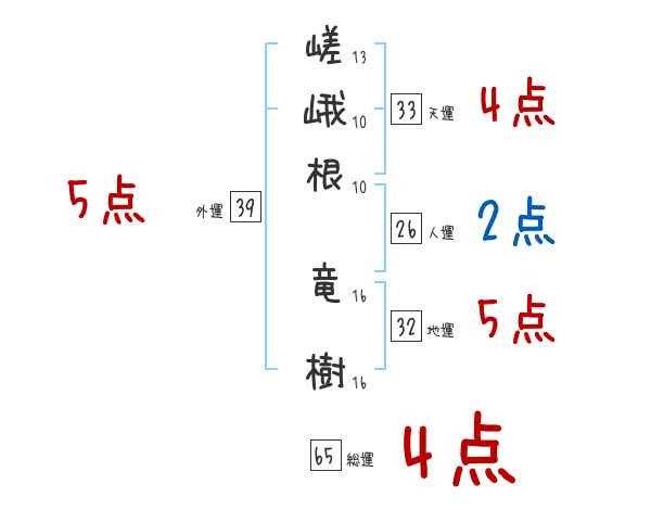 総運![]() | 嵯峨根竜樹さんの総運は65画の4つ星!幸運に恵まれ繁栄する。包容力がある。 あなたの人生を表す1番重要な運勢です。生涯を通じて影響する総合運となり、主に50歳以降の晩年期に影響を及ぼします。 |