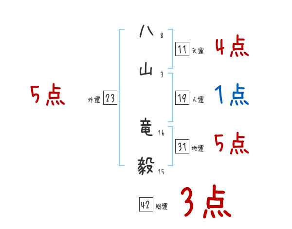 天運![]() | 八山竜毅さんの天運は11画の4つ星!着実に富や地位を得る幸運な人生。 家系が持つ宿命的な運勢を表します。祖先から受け継いだ苗字ですので自分の力が及びません。家柄を象徴します。 |