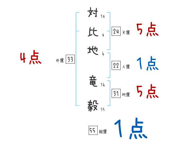 外運![]() | 対比地竜毅さんの外運は33画の4つ星!権力志向でプライドが高い。勇気があり運を切り開き成功する。 生活面を象徴する運勢です。外部から受ける影響力を表し、結婚運、家庭運や職場、環境への順応性を表します。 |