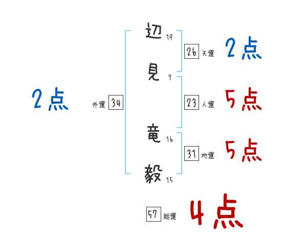 外運![]() | 辺見竜毅さんの外運は34画の2つ星!独創性に優れるが、自尊心が強く災難に注意しましょう。 生活面を象徴する運勢です。外部から受ける影響力を表し、結婚運、家庭運や職場、環境への順応性を表します。 |