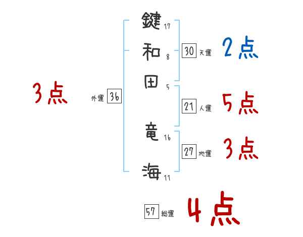 天運![]() | 鍵和田竜海さんの天運は30画の2つ星!浮き沈みの激しさに注意しましょう。 家系が持つ宿命的な運勢を表します。祖先から受け継いだ苗字ですので自分の力が及びません。家柄を象徴します。 |