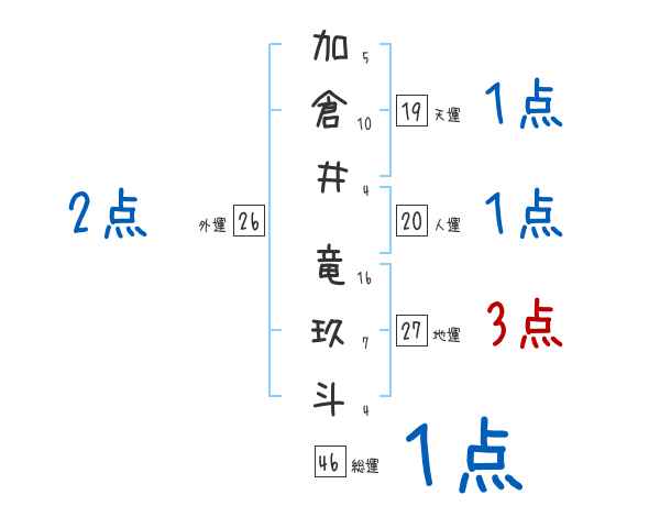 総運![]() | 加倉井竜玖斗さんの総運は46画の1つ星!迷走することが多く苦労するかも。目先のことにとらわれないように。 あなたの人生を表す1番重要な運勢です。生涯を通じて影響する総合運となり、主に50歳以降の晩年期に影響を及ぼします。 |